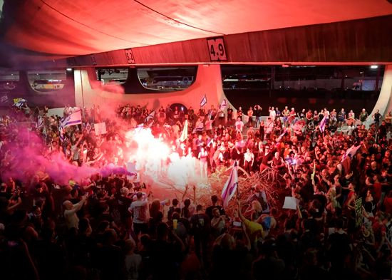 Según el diario israelí Haaretz, la cifra de asistencia en Tel Aviv ronda las 300,000 personas. A las afueras de la ciudad, los manifestantes bloquearon las autopistas, llegando a crear barricadas de neumáticos en llamas para ello. También en la portuaria Haifa, al norte del país, miles de personas bloquearon enarbolando la bandera nacional los accesos a la ciudad. Las protestas continuarán a lo largo de la semana, ya que la organización de sindicatos más grande de Israel, Histadrut, anunció una huelga general a partir de mañana lunes, que incluirá al aeropuerto internacional de Tel Aviv.