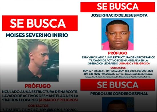 De acuerdo con las autoridades, los fugitivos estarían vinculados a una organización criminal transnacional a la que se le ocuparon 643 paquetes de cocaína, así como bienes millonarios, durante 17 allanamientos y operativos simultáneos realizados en el Distrito Nacional, Santo Domingo Este, Guerra, Boca Chica, Barahona, Santiago, Higüey, Cap Cana y La Romana.