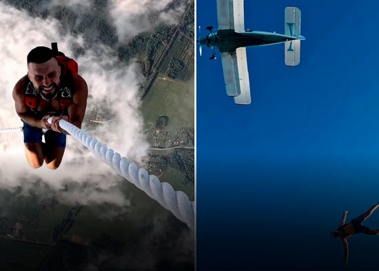 El residente de la ciudad rusa de Krasnoznámensk Alexánder Chubárov ha realizado en el aire una insólita acrobacia digna del Libro Guinness de los Récords. El hombre descendió por una cuerda desde un An-2 en pleno vuelo y tras dar varias vueltas en el aire llevando nada más que una mochila a sus espaldas, regresó al avión por la misma cuerda, sonriendo.