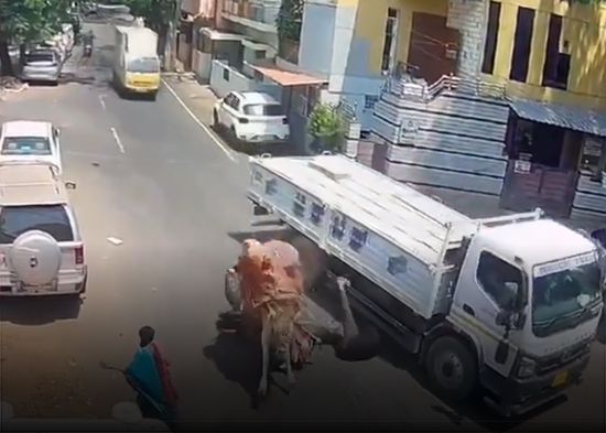 Un hombre en ciclomotor escapó por poco de la muerte en la ciudad india de Bangalore la semana pasada cuando un toro, que era guiado por una mujer con una cuerda, lo embistió, lanzándolo bajo un camión en movimiento. Afortunadamente, el conductor logró detener el vehículo en el último momento y evitó la tragedia.