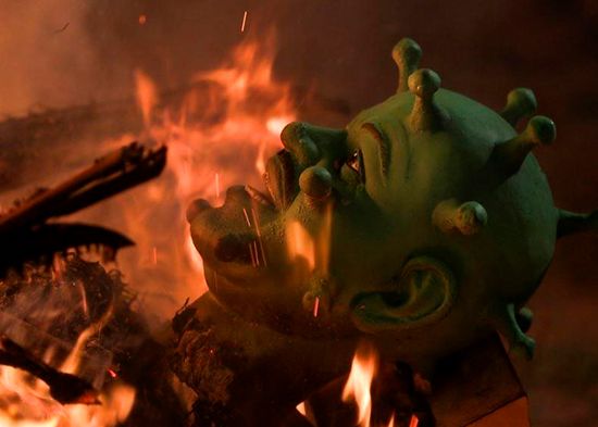 Queman muñeco de coronavirus en India para arrancar el 2021