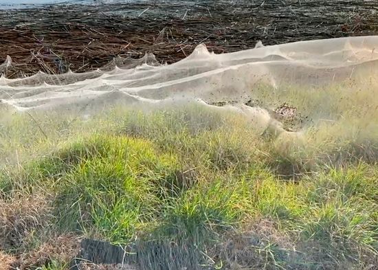 En las imágenes, compartidas esta semana por residentes locales en las redes sociales tras volver a sus viviendas, se pueden ver numerosas y gruesas mantas de telaraña cubriendo los prados y colgando de las ramas de los árboles.