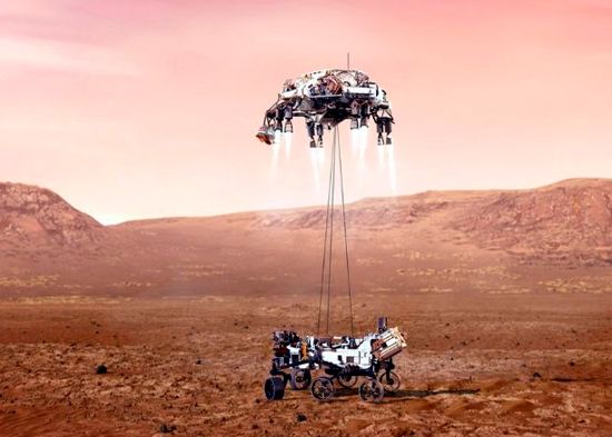 El Perseverance descenderá sobre la superficie marciana sujetado por una "grúa celestial".